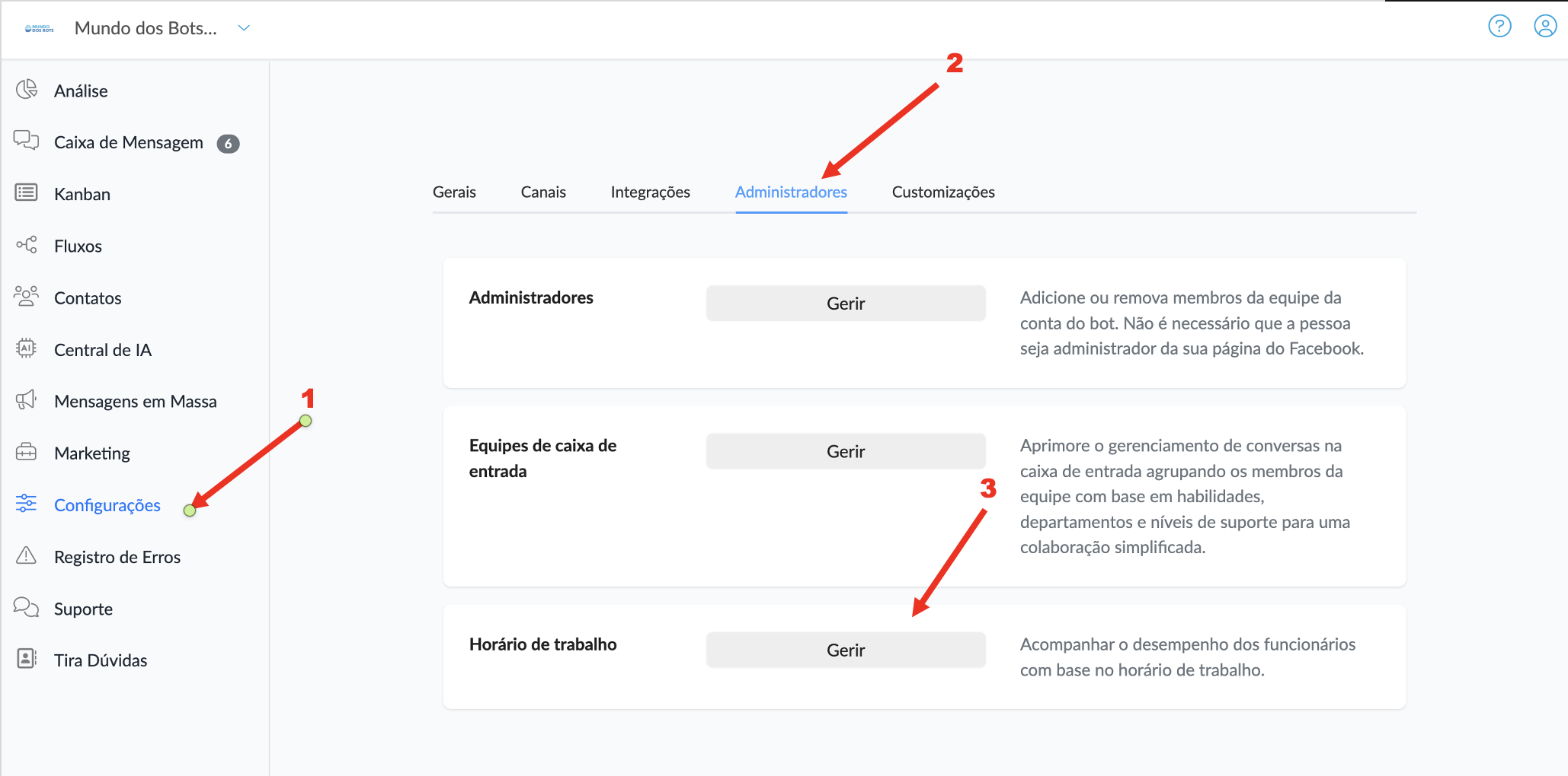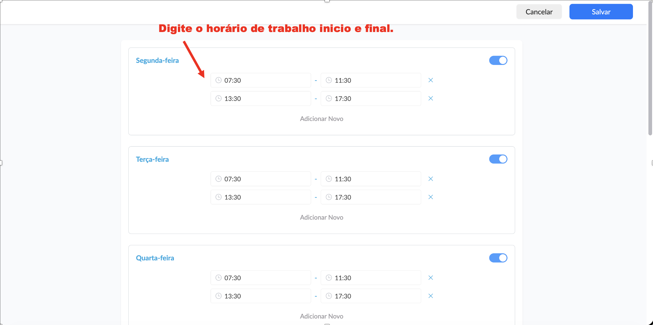 - Defina o horário de trabalho de cada colaborador → Vá em Configurações > Administradores> Horário de Trabalho